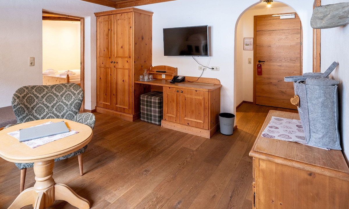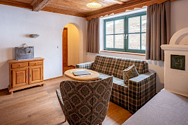 Das großzügige Studio im Turm des Jagdschlössls mit zwei getrennten Schlafzimmern und traditioneller Turm-Wohnstube.
