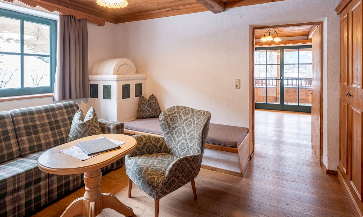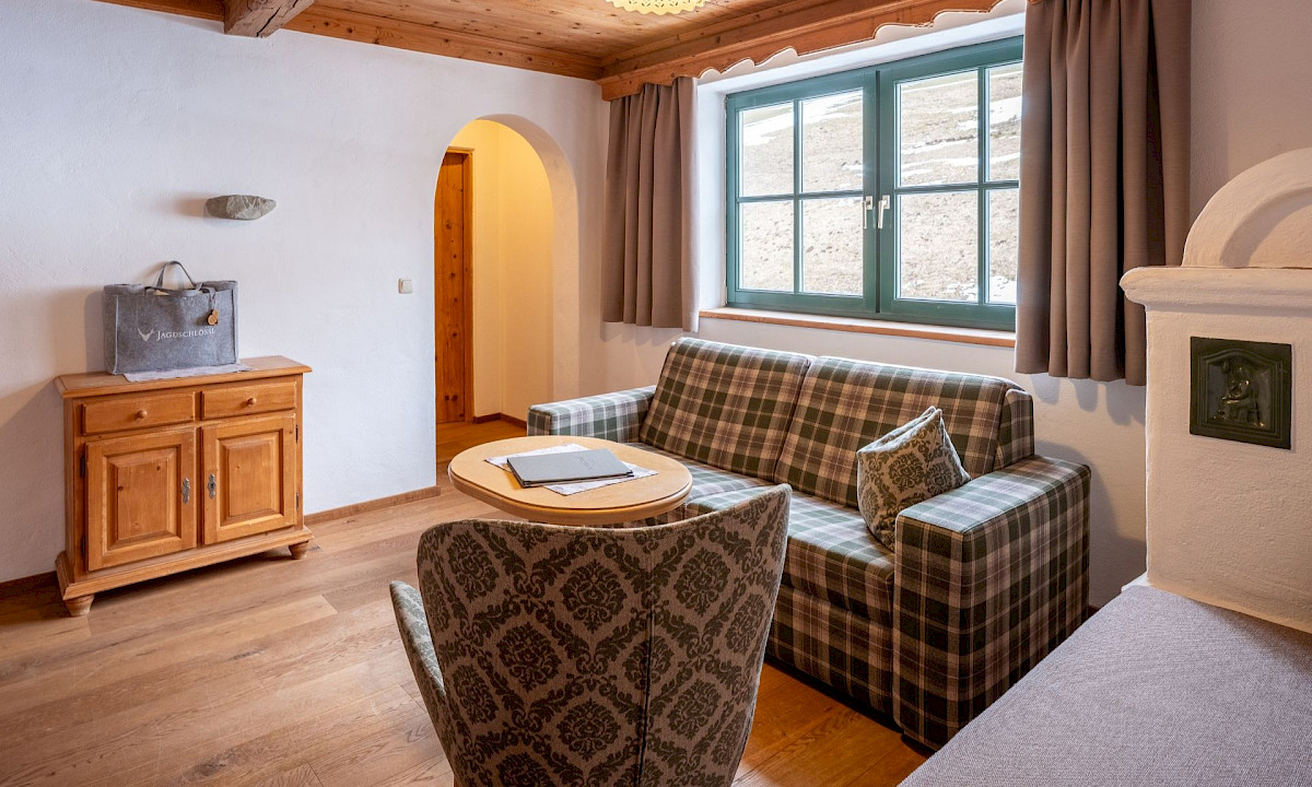Die Kaisersuite Junior mit 60 m² und eigener Terrasse sowie Kachelofen für wahrlich kaiserlichen Genuss.